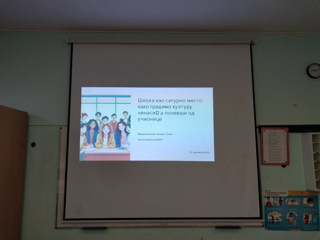 У оквиру тима за заштиту од ДНЗЗ 12.12.2025. године ученици наше школе су учествовали у радионици „Школа као сигурно место: како градимо културу ненасиља почевши од учионице“. Ученици су имали задатак да реше различите конфликтне ситуације и изнесу своје закључке на ову тему. Радионицу је водила координатор Тима и наставник енглеског језика Милка Митровић.