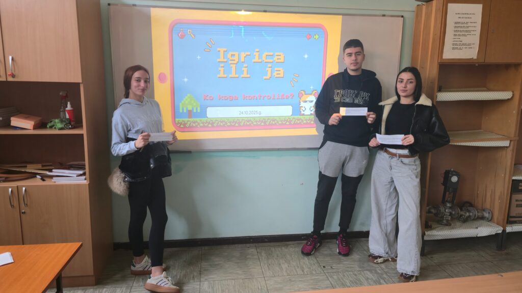 У петак, 24.10.2025. године, ученици су узели активно учешће у радионици на ову тему коју је припремила педагог школе. Циљеви радионице су били: препознавање проблематичног играња игрица, развијање свести о последицама по здравље, као и начини да до озбиљних последица не дође.